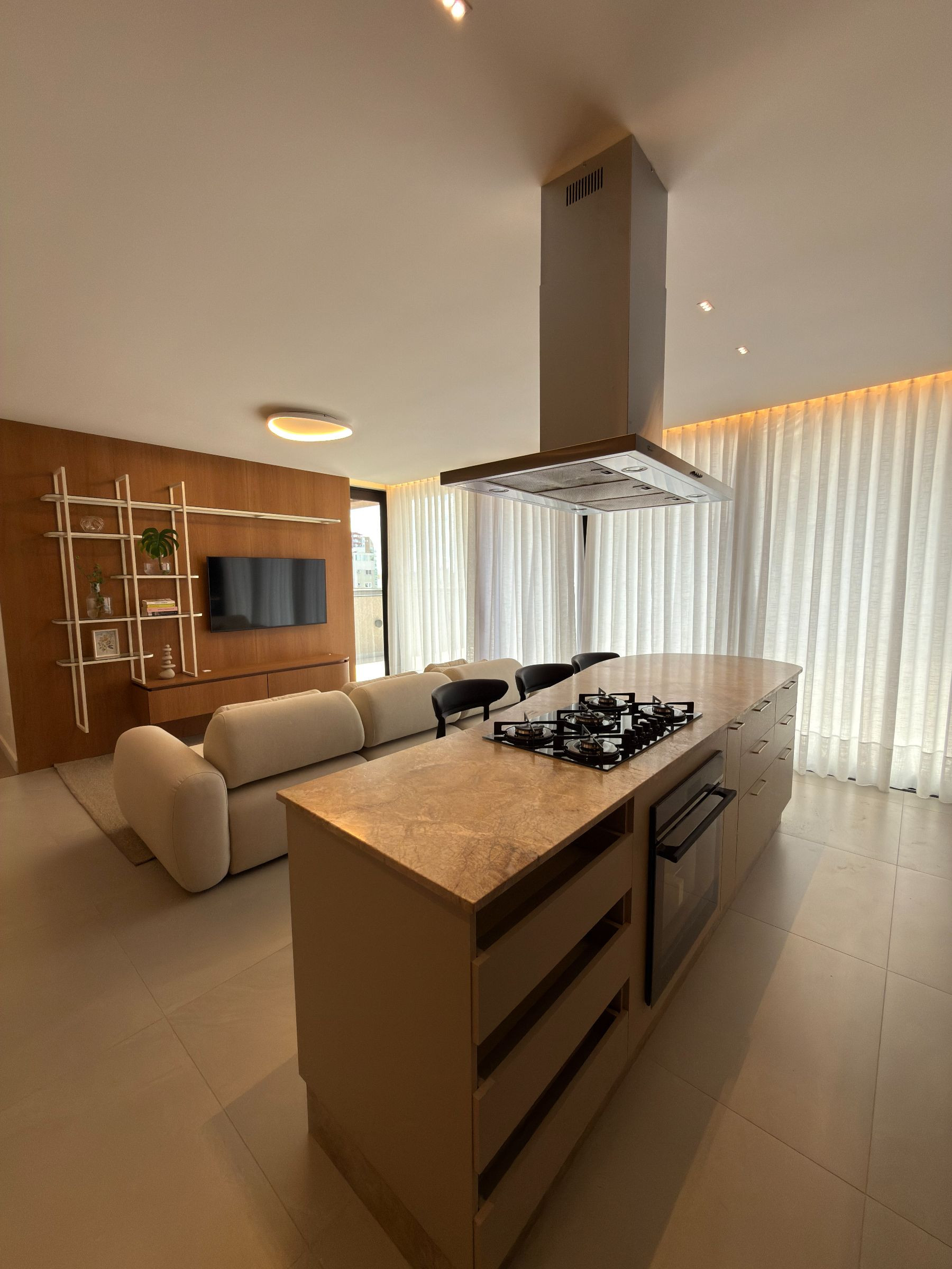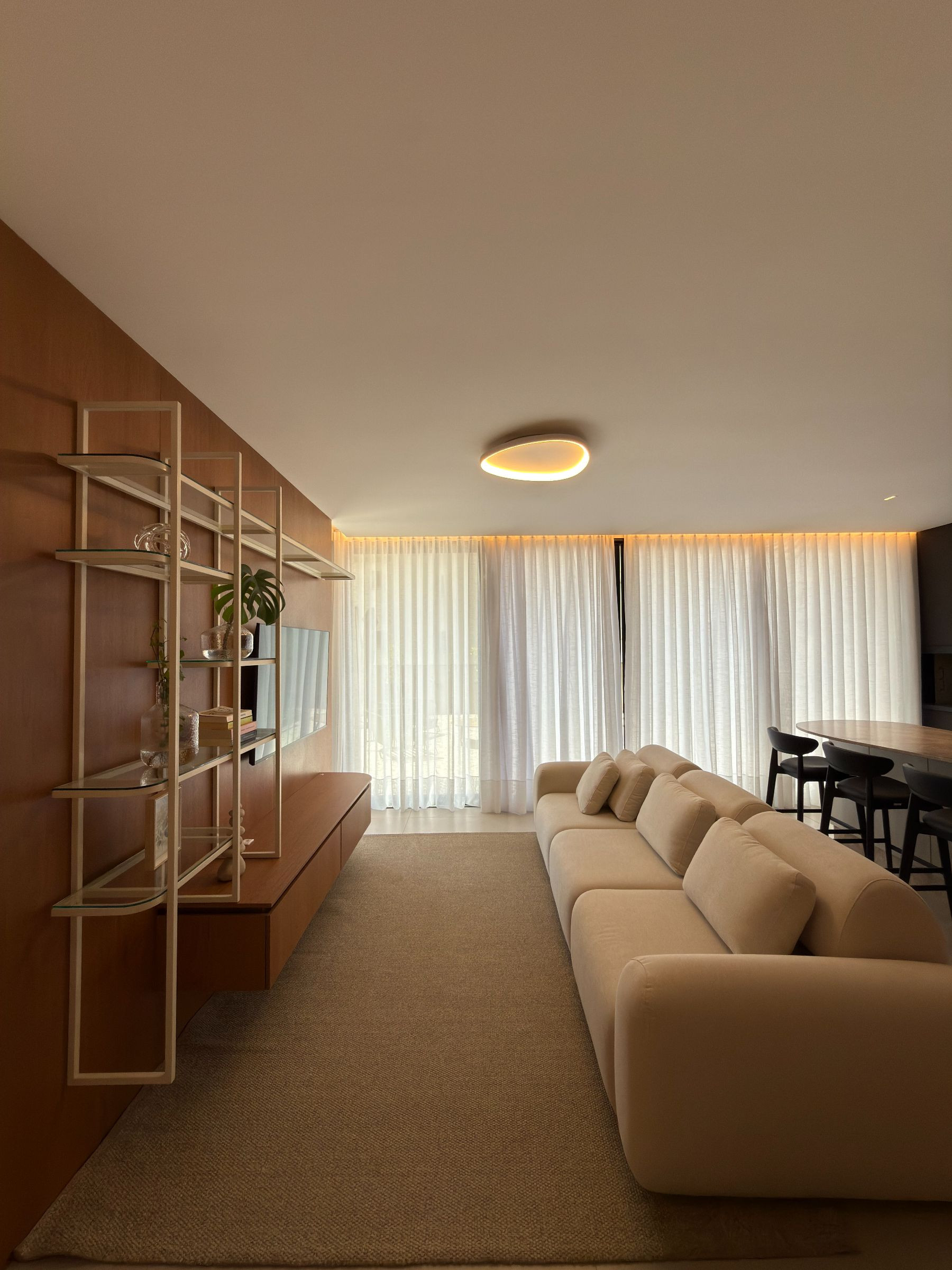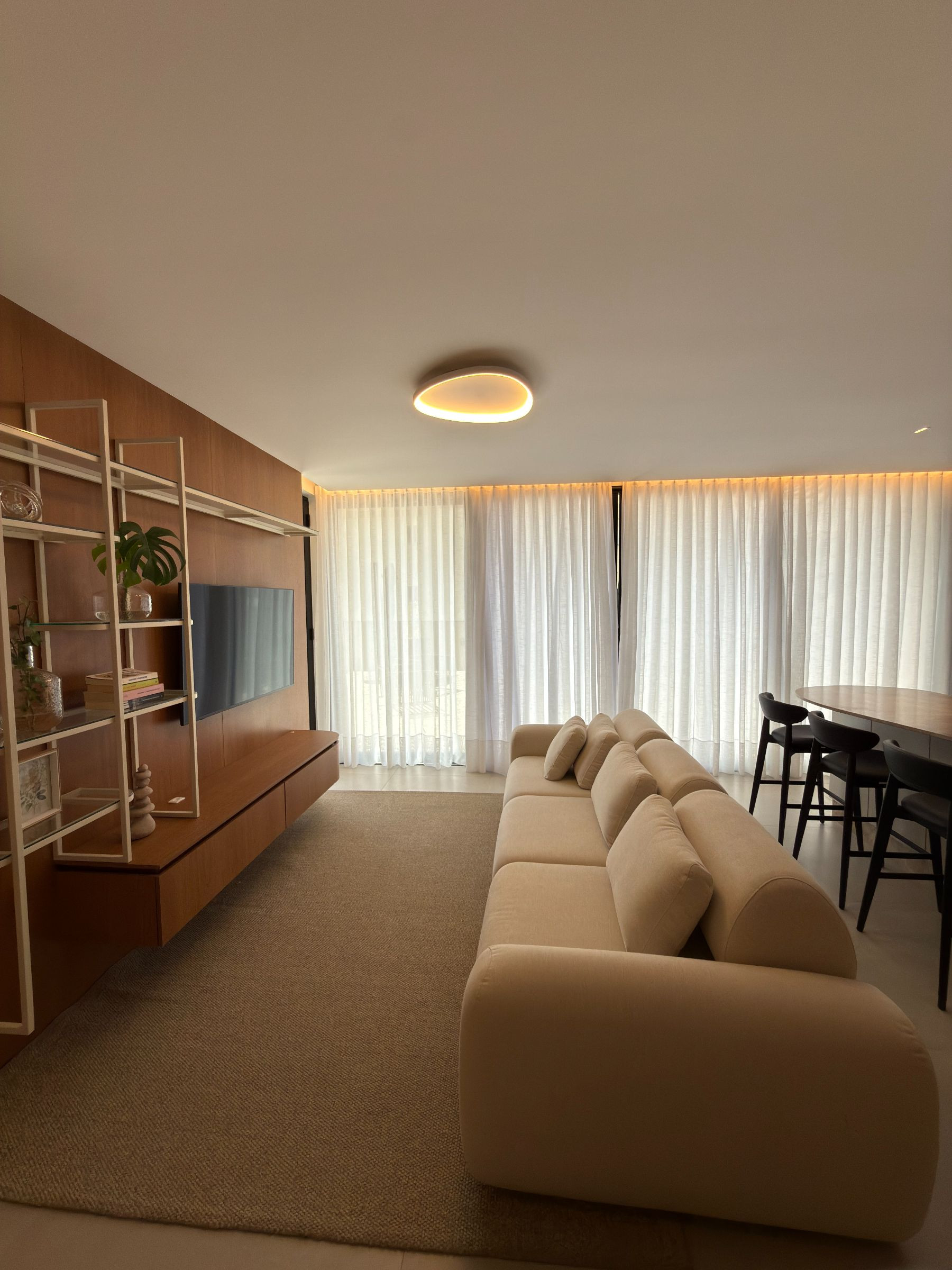 Living amplo (sala de estar, jantar com churrasqueira - mobiliado conforme as fotos)