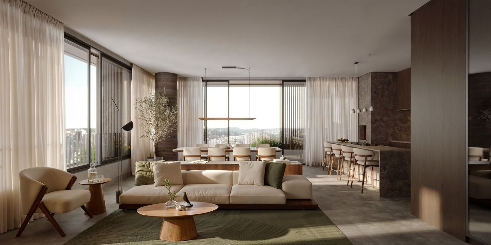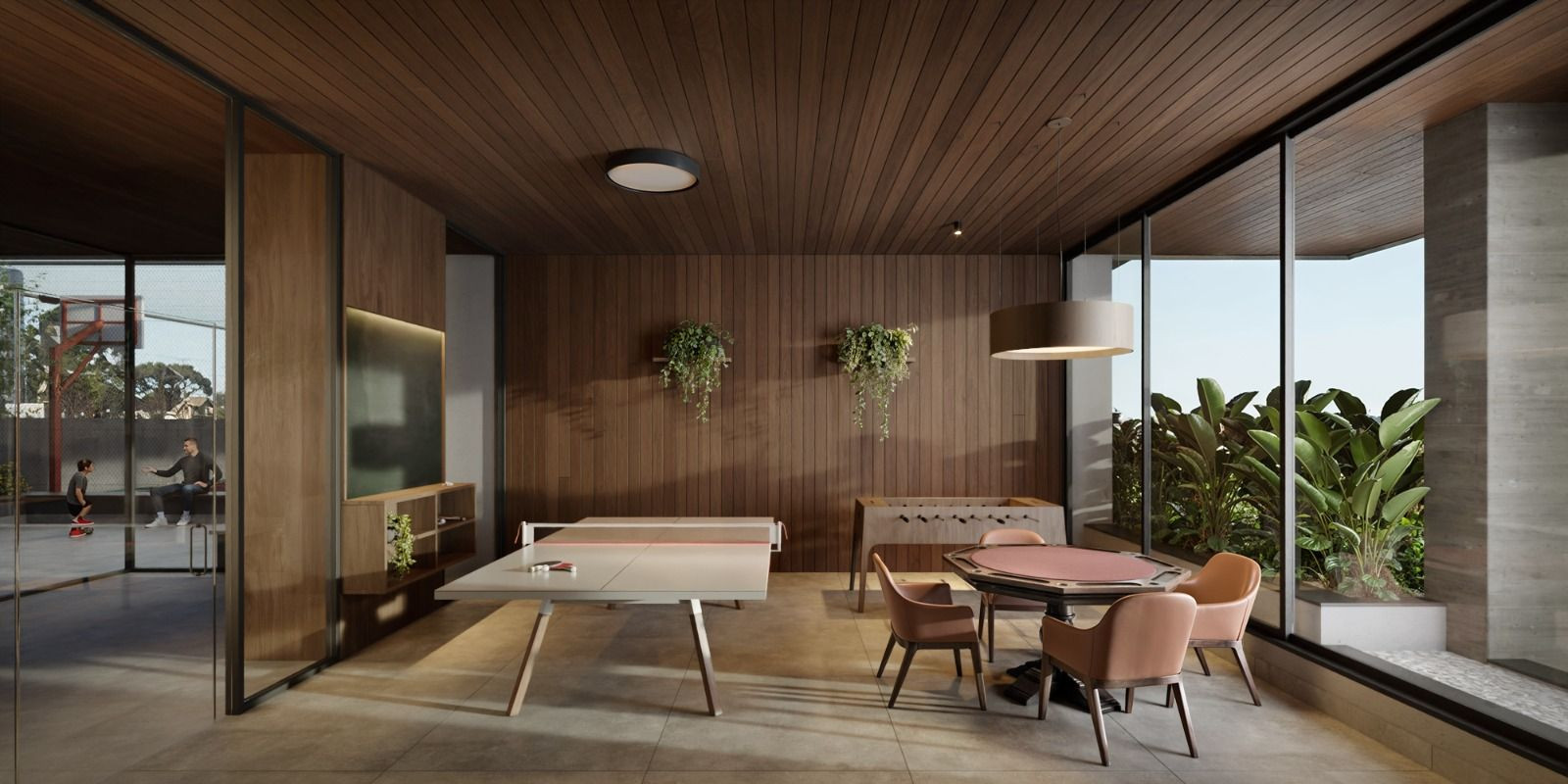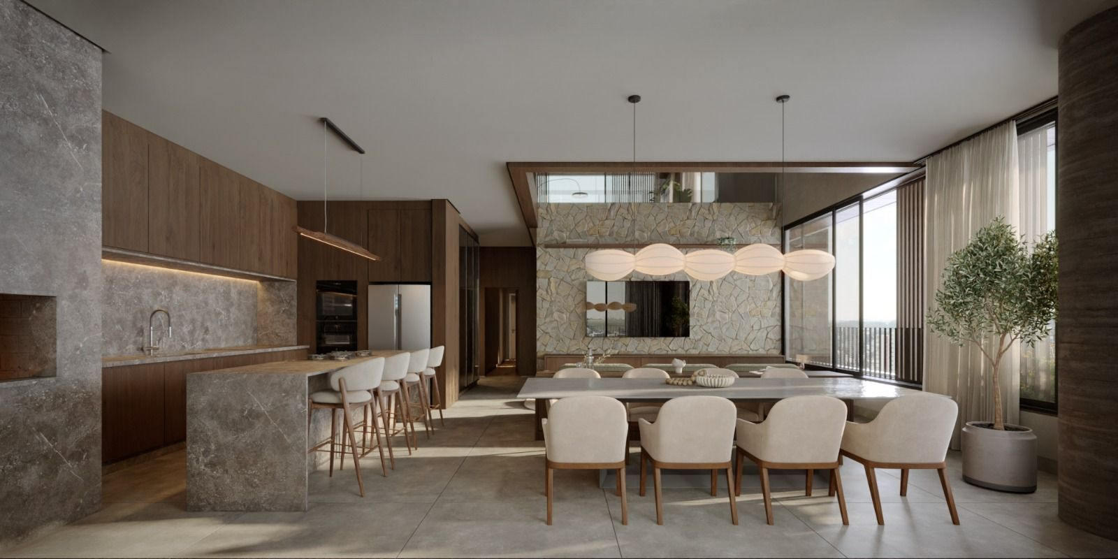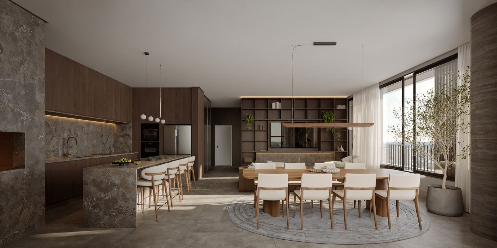 - Sala de estar e jantar amplas integradas com churrasqueira